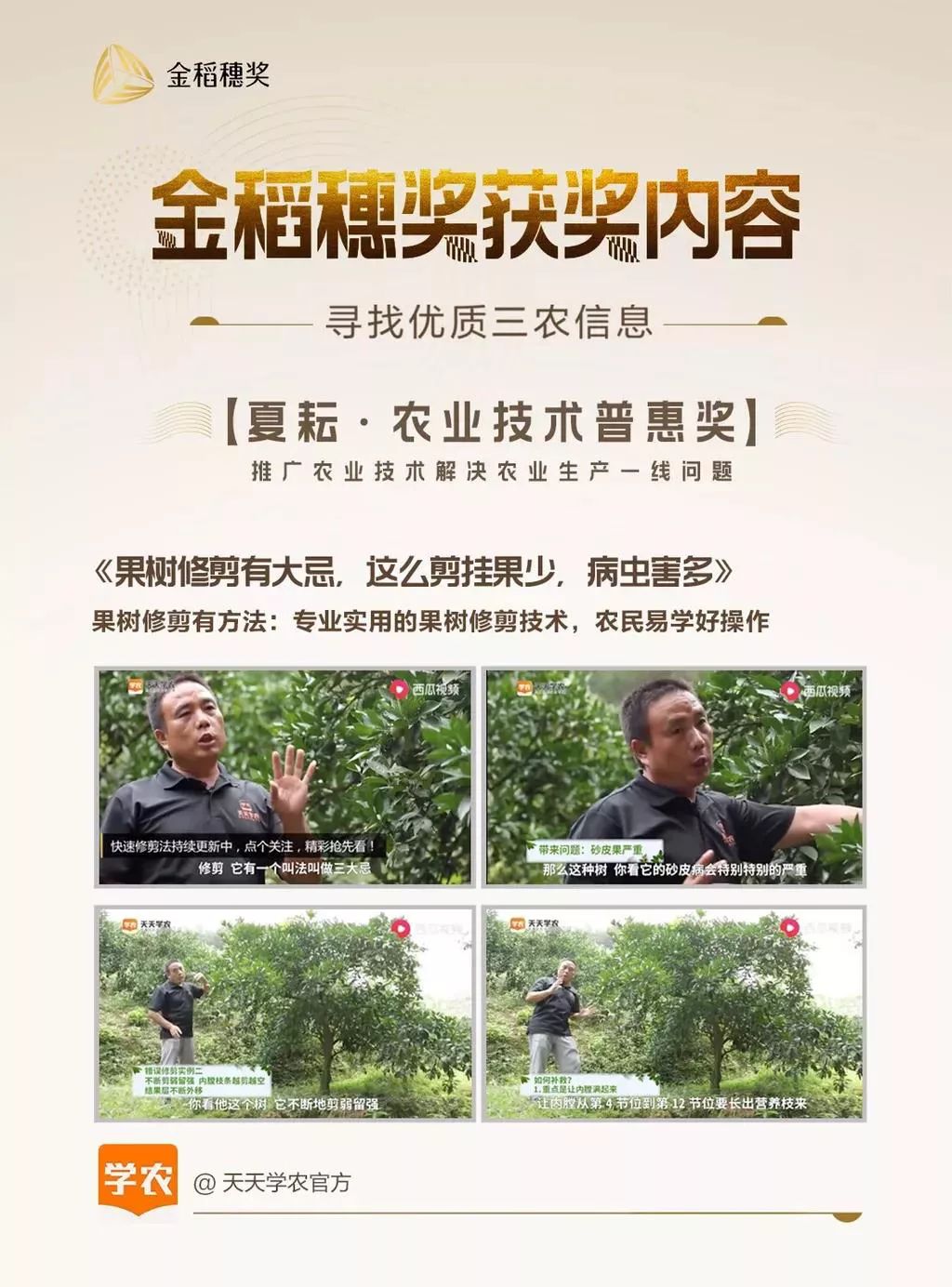 2019年4月11日,,,,,,,,中国首个移动互联网领域三农信息奖项“金稻穗奖”颁奖仪式在安徽巢湖举行。。。。。天天学农受邀加入仪式,,,,,,,,并荣获“金稻穗·夏耘 农业手艺普惠内容奖”。。。。。 “金稻穗奖”由农民日报和字节跳动团结提倡。。。。。农民日报是中国权威的三农媒体,,,,,,,,而字节跳动旗下产品今日头条是中国最大的三农信息平台。。。。。“金稻穗奖”聚焦于评选移动时代有价值的三农信息,,,,,,,,并夸奖在三农领域有突出孝顺的内容创作者。。。。。天天学农作为海内领先的农业知识付费平台,,,,,,,,也是海内着名农业教育效劳公司,,,,,,,,此次获奖的作品名为《果树修剪有大忌,,,,,,,,这么剪,,,,,,,,挂果少,,,,,,,,病虫害多!》。。。。。作品节选自天天学农讲师钟善东的《成年树丰产修剪手艺》。。。。。他独创的快速修剪手艺,,,,,,,,为宽大果农解决了修剪难题。。。。。 天天学农平台现在拥有“农技”、“ 农商”、“ 视野”三大学院,,,,,,,,累计相助专家500多位。。。。。天天学农APP已上线5000多节精品课程,,,,,,,,吸引了100多万用户,,,,,,,,同时打造了包括微信公众号、头条号、种种视频号等的多作物内容矩阵,,,,,,,,以音视频、图文等形式为包括2.6亿莳植户在内的3亿涉农人群提供有价值的农业知识效劳,,,,,,,,周全提升农户们的莳植和治理水平。。。。。 ▲天天学农首创合资人王显着 据相识,,,,,,,,本届“金稻穗奖”共设置了4大奖项种别:优美墟落风貌奖、农业手艺普惠奖、山货助农增收奖、乡风文明传承奖,,,,,,,,划分旨在表扬泛起墟落美景景物、推广农业手艺、资助农产品上行、纪录农村原生态生涯的优质内容及创作者。。。。。每个奖项种别,,,,,,,,包括1小我私家物大奖和3个内容奖。。。。。天天学农平台自建设以来,,,,,,,,一直致力于推广农业手艺,,,,,,,,打造了包括柑橘、猕猴桃、葡萄、芒果、草莓、蔬菜等多作物品类的农技课程,,,,,,,,涵盖品种选择、莳植治理、营养施肥、病虫害防治、采收清园等全方位内容,,,,,,,,贯串产前、产中、产后各个环节,,,,,,,,扎实提升用户农技水平。。。。。 “金稻穗奖”让都会相识农村,,,,,,,,让墟落修养都会。。。。。优质三农信息加移动互联网,,,,,,,,能够让莳植手艺、乡风文明等内容飞入寻常黎民家,,,,,,,,让三农理念融入千家万户。。。。。天天学农首创合资人王显着体现:“天天学农的内容受到宽大农民用户及偕行的认可和接待,,,,,,,,批注我们起劲的偏向是对的,,,,,,,,以后,,,,,,,,我们当越提议劲,,,,,,,,为用户创作更好的内容,,,,,,,,创立更多的价值!”