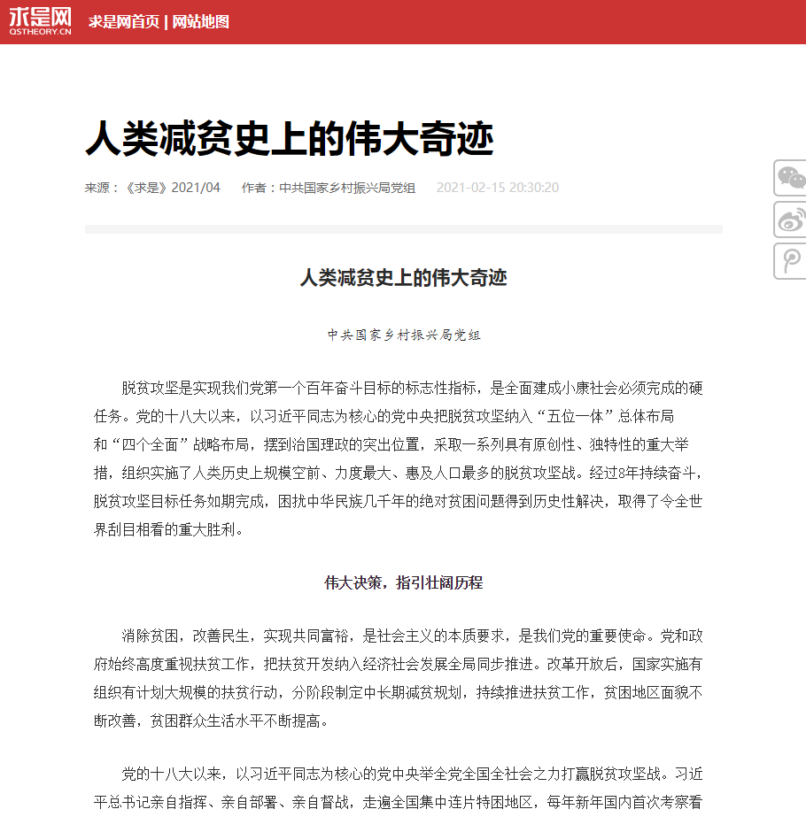 2月16日出书的《求是》杂志2021年第4期揭晓“中共国家墟落振兴局党组”的署名文章《人类减贫史上的伟大事业》,,,,,,,文章从十一个方面总结了通过精准扶贫“攻克千年难题”的中国履历,,,,,,,从八个方面概述了“特出人类减贫史册”的中国孝顺。。。。。 。。 。