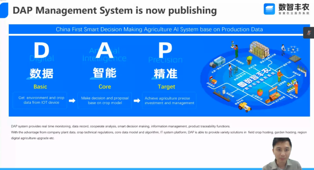 8月19日下昼,,,,,,97国际控股受邀加入“亚洲相互协作与信托步伐聚会智慧农业应用与生长研修班(第二期)”(简称亚信智慧农业应用与生长研修班(第二期)),,,,,,数智97国际CTO李宇炫以《DAP数智化在农业莳植中的应用探讨》为主题举行专题分享。。。。。。。。 亚洲相互协作与信托步伐聚会(Conference on Interaction and Confidence Building Measures in Asia,,,,,,CICA)简称“亚信聚会”,,,,,,是一个有关清静问题的多边论坛,,,,,,其宗旨是在亚洲国家之间讨论增强相助、增添信托的步伐。。。。。。。。 “亚信智慧农业应用与生长研修班(第二期)”由中华人民共和外洋交部、教育部主理,,,,,,亚信秘书处协办,,,,,,华中农业大学承办。。。。。。。。来自哈萨克斯坦、泰国、越南、土耳其、孟加拉国、巴林、蒙古国、乌兹别克斯坦和中国等9个亚信成员国的高等院校、科研院所企业的教学科研职员出席,,,,,,全程接纳英语交流,,,,,,围绕“生物大数据与智能育种、智能装备与智慧生产”偏向,,,,,,对“物联网、大数据、云盘算等智慧农业产前、产中、产后的治理与应用分享”话题举行探讨分享。。。。。。。。 在农业大数据与宏观农业经济专题环节,,,,,,李宇炫以“DAP数智化在农业莳植中的应用探讨”为切入点举行讲话,,,,,,重点先容数智97国际智慧农服系统(简称数智97国际)基础情形以及在现实农业生产中的应用。。。。。。。。 李宇炫强调,,,,,,数智97国际是中国首个基于作物情形与生长数据的人工智能决议农服系统,,,,,,系统以大数据为基础、通过人工智能举行剖析决议,,,,,,实现农场治理的信息化、数字化、智能化、精准化,,,,,,真正做到用智慧手段资助农业降本增收。。。。。。。。现在,,,,,,系统已经研发出水稻、小麦、花生、柑橘、芒果、葡萄等作物的数字生产模子,,,,,,为作物生产提供24小时智慧决议,,,,,,实现精准治理。。。。。。。。 自数智97国际上线运行以来,,,,,,农科院、现代农业工业园、大型农场、县农业农村局已经使用系统,,,,,,与农科院相助的花生繁育-生产-加工一体化的智慧农业树模基地,,,,,,数智97国际正综合运用数智化气象站、无人机、高精量的农业机械以及独吞的花生模子,,,,,,全阶段把控花生生长的各个环节,,,,,,选地、选种、整地、播种、药肥治理、病虫害监测等生产环节无一遗漏。。。。。。。。