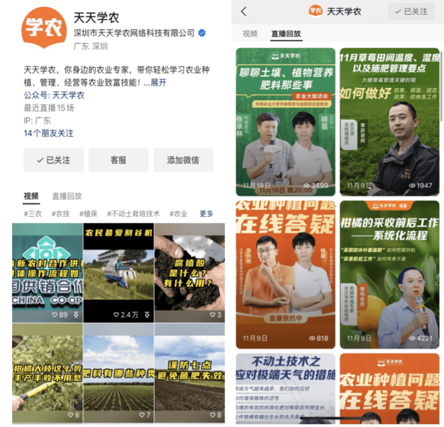 制订与实验全方位运营战略,,,,,,,,深入下层开展联动事情 。。。。。。。。天天学农以“1+N”多种宣传矩阵配合增进数字教育模式宣传,,,,,,,,利便用户从多方面相识数字化教学平台,,,,,,,,随时加入学习 。。。。。。。。现在,,,,,,,,除自有平台外,,,,,,,,还开放了天天学农APP及小程序及微站入口、视频号、直播专栏、头条号、企业微信及私域账号等学习平台 。。。。。。。。除此之外,,,,,,,,天天学农联和共青团、妇联等单位,,,,,,,,建设一套自上至下组织发动系统,,,,,,,,明确指标、剖析使命,,,,,,,,有用链接各地农民学员,,,,,,,,周全笼罩广东所有地市、区县、州里及行政村 。。。。。。。。