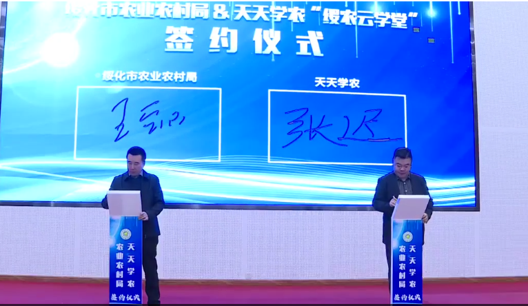 绥化市农业农村局局长王宝峰与天天学农商务总监张迟签署了“绥农云学堂”培训平台相助协议。。。。。。。天天学农将继续凭证绥化市农业生长现状以及农户生产能力水平,,,,,,,,举行课程定制化开发清静台运营维护,,,,,,,,为更多农业生产者提供线上学习效劳。。。。。。。